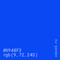 Цвет #0948F3 в цветовой модели RGB обозначается тремя октетами (9, 72, 243) в десятичном формате и #0948F3 в шестнадцатиричном (hex) формате, которые являются интенсивностью красного 9 (hex 09), интенсивность зелёного 72 (hex 48) и интенсивность синего 243 (hex F3).