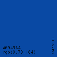 Цвет #0949A4 в цветовой модели RGB обозначается тремя октетами (9, 73, 164) в десятичном формате и #0949A4 в шестнадцатиричном (hex) формате, которые являются интенсивностью красного 9 (hex 09), интенсивность зелёного 73 (hex 49) и интенсивность синего 164 (hex A4).