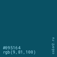 Цвет #095164 в цветовой модели RGB обозначается тремя октетами (9, 81, 100) в десятичном формате и #095164 в шестнадцатиричном (hex) формате, которые являются интенсивностью красного 9 (hex 09), интенсивность зелёного 81 (hex 51) и интенсивность синего 100 (hex 64).