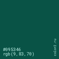 Цвет #095346 в цветовой модели RGB обозначается тремя октетами (9, 83, 70) в десятичном формате и #095346 в шестнадцатиричном (hex) формате, которые являются интенсивностью красного 9 (hex 09), интенсивность зелёного 83 (hex 53) и интенсивность синего 70 (hex 46).
