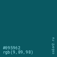 Цвет #095962 в цветовой модели RGB обозначается тремя октетами (9, 89, 98) в десятичном формате и #095962 в шестнадцатиричном (hex) формате, которые являются интенсивностью красного 9 (hex 09), интенсивность зелёного 89 (hex 59) и интенсивность синего 98 (hex 62).
