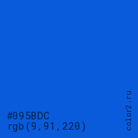 Цвет #095BDC в цветовой модели RGB обозначается тремя октетами (9, 91, 220) в десятичном формате и #095BDC в шестнадцатиричном (hex) формате, которые являются интенсивностью красного 9 (hex 09), интенсивность зелёного 91 (hex 5B) и интенсивность синего 220 (hex DC).