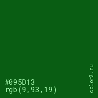 Цвет #095D13 в цветовой модели RGB обозначается тремя октетами (9, 93, 19) в десятичном формате и #095D13 в шестнадцатиричном (hex) формате, которые являются интенсивностью красного 9 (hex 09), интенсивность зелёного 93 (hex 5D) и интенсивность синего 19 (hex 13).