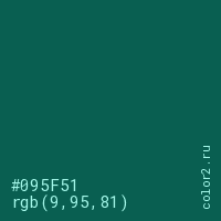 Цвет #095F51 в цветовой модели RGB обозначается тремя октетами (9, 95, 81) в десятичном формате и #095F51 в шестнадцатиричном (hex) формате, которые являются интенсивностью красного 9 (hex 09), интенсивность зелёного 95 (hex 5F) и интенсивность синего 81 (hex 51).