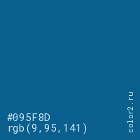 Цвет #095F8D в цветовой модели RGB обозначается тремя октетами (9, 95, 141) в десятичном формате и #095F8D в шестнадцатиричном (hex) формате, которые являются интенсивностью красного 9 (hex 09), интенсивность зелёного 95 (hex 5F) и интенсивность синего 141 (hex 8D).