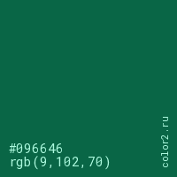 Цвет #096646 в цветовой модели RGB обозначается тремя октетами (9, 102, 70) в десятичном формате и #096646 в шестнадцатиричном (hex) формате, которые являются интенсивностью красного 9 (hex 09), интенсивность зелёного 102 (hex 66) и интенсивность синего 70 (hex 46).