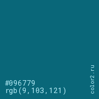 Цвет #096779 в цветовой модели RGB обозначается тремя октетами (9, 103, 121) в десятичном формате и #096779 в шестнадцатиричном (hex) формате, которые являются интенсивностью красного 9 (hex 09), интенсивность зелёного 103 (hex 67) и интенсивность синего 121 (hex 79).