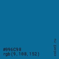 Цвет #096C98 в цветовой модели RGB обозначается тремя октетами (9, 108, 152) в десятичном формате и #096C98 в шестнадцатиричном (hex) формате, которые являются интенсивностью красного 9 (hex 09), интенсивность зелёного 108 (hex 6C) и интенсивность синего 152 (hex 98).