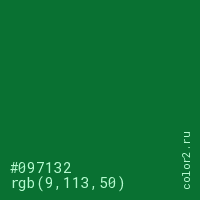 Цвет #097132 в цветовой модели RGB обозначается тремя октетами (9, 113, 50) в десятичном формате и #097132 в шестнадцатиричном (hex) формате, которые являются интенсивностью красного 9 (hex 09), интенсивность зелёного 113 (hex 71) и интенсивность синего 50 (hex 32).