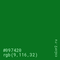 Цвет #097420 в цветовой модели RGB обозначается тремя октетами (9, 116, 32) в десятичном формате и #097420 в шестнадцатиричном (hex) формате, которые являются интенсивностью красного 9 (hex 09), интенсивность зелёного 116 (hex 74) и интенсивность синего 32 (hex 20).