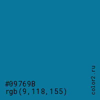 Цвет #09769B в цветовой модели RGB обозначается тремя октетами (9, 118, 155) в десятичном формате и #09769B в шестнадцатиричном (hex) формате, которые являются интенсивностью красного 9 (hex 09), интенсивность зелёного 118 (hex 76) и интенсивность синего 155 (hex 9B).
