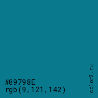 Цвет #09798E в цветовой модели RGB обозначается тремя октетами (9, 121, 142) в десятичном формате и #09798E в шестнадцатиричном (hex) формате, которые являются интенсивностью красного 9 (hex 09), интенсивность зелёного 121 (hex 79) и интенсивность синего 142 (hex 8E).