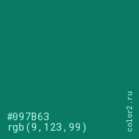 Цвет #097B63 в цветовой модели RGB обозначается тремя октетами (9, 123, 99) в десятичном формате и #097B63 в шестнадцатиричном (hex) формате, которые являются интенсивностью красного 9 (hex 09), интенсивность зелёного 123 (hex 7B) и интенсивность синего 99 (hex 63).