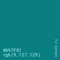 Цвет #097F81 в цветовой модели RGB обозначается тремя октетами (9, 127, 129) в десятичном формате и #097F81 в шестнадцатиричном (hex) формате, которые являются интенсивностью красного 9 (hex 09), интенсивность зелёного 127 (hex 7F) и интенсивность синего 129 (hex 81).