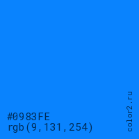 Цвет #0983FE в цветовой модели RGB обозначается тремя октетами (9, 131, 254) в десятичном формате и #0983FE в шестнадцатиричном (hex) формате, которые являются интенсивностью красного 9 (hex 09), интенсивность зелёного 131 (hex 83) и интенсивность синего 254 (hex FE).