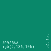 Цвет #09886A в цветовой модели RGB обозначается тремя октетами (9, 136, 106) в десятичном формате и #09886A в шестнадцатиричном (hex) формате, которые являются интенсивностью красного 9 (hex 09), интенсивность зелёного 136 (hex 88) и интенсивность синего 106 (hex 6A).