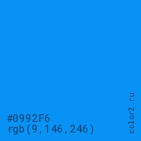 Цвет #0992F6 в цветовой модели RGB обозначается тремя октетами (9, 146, 246) в десятичном формате и #0992F6 в шестнадцатиричном (hex) формате, которые являются интенсивностью красного 9 (hex 09), интенсивность зелёного 146 (hex 92) и интенсивность синего 246 (hex F6).