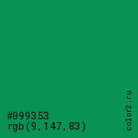 Цвет #099353 в цветовой модели RGB обозначается тремя октетами (9, 147, 83) в десятичном формате и #099353 в шестнадцатиричном (hex) формате, которые являются интенсивностью красного 9 (hex 09), интенсивность зелёного 147 (hex 93) и интенсивность синего 83 (hex 53).