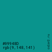Цвет #09948D в цветовой модели RGB обозначается тремя октетами (9, 148, 141) в десятичном формате и #09948D в шестнадцатиричном (hex) формате, которые являются интенсивностью красного 9 (hex 09), интенсивность зелёного 148 (hex 94) и интенсивность синего 141 (hex 8D).