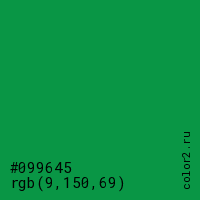 Цвет #099645 в цветовой модели RGB обозначается тремя октетами (9, 150, 69) в десятичном формате и #099645 в шестнадцатиричном (hex) формате, которые являются интенсивностью красного 9 (hex 09), интенсивность зелёного 150 (hex 96) и интенсивность синего 69 (hex 45).