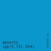 Цвет #0997CC в цветовой модели RGB обозначается тремя октетами (9, 151, 204) в десятичном формате и #0997CC в шестнадцатиричном (hex) формате, которые являются интенсивностью красного 9 (hex 09), интенсивность зелёного 151 (hex 97) и интенсивность синего 204 (hex CC).