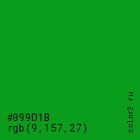 Цвет #099D1B в цветовой модели RGB обозначается тремя октетами (9, 157, 27) в десятичном формате и #099D1B в шестнадцатиричном (hex) формате, которые являются интенсивностью красного 9 (hex 09), интенсивность зелёного 157 (hex 9D) и интенсивность синего 27 (hex 1B).