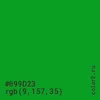 Цвет #099D23 в цветовой модели RGB обозначается тремя октетами (9, 157, 35) в десятичном формате и #099D23 в шестнадцатиричном (hex) формате, которые являются интенсивностью красного 9 (hex 09), интенсивность зелёного 157 (hex 9D) и интенсивность синего 35 (hex 23).