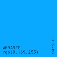 Цвет #09A9FF в цветовой модели RGB обозначается тремя октетами (9, 169, 255) в десятичном формате и #09A9FF в шестнадцатиричном (hex) формате, которые являются интенсивностью красного 9 (hex 09), интенсивность зелёного 169 (hex A9) и интенсивность синего 255 (hex FF).
