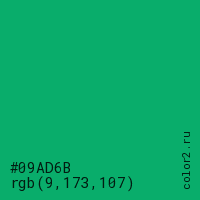 Цвет #09AD6B в цветовой модели RGB обозначается тремя октетами (9, 173, 107) в десятичном формате и #09AD6B в шестнадцатиричном (hex) формате, которые являются интенсивностью красного 9 (hex 09), интенсивность зелёного 173 (hex AD) и интенсивность синего 107 (hex 6B).