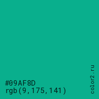 Цвет #09AF8D в цветовой модели RGB обозначается тремя октетами (9, 175, 141) в десятичном формате и #09AF8D в шестнадцатиричном (hex) формате, которые являются интенсивностью красного 9 (hex 09), интенсивность зелёного 175 (hex AF) и интенсивность синего 141 (hex 8D).