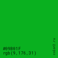 Цвет #09B01F в цветовой модели RGB обозначается тремя октетами (9, 176, 31) в десятичном формате и #09B01F в шестнадцатиричном (hex) формате, которые являются интенсивностью красного 9 (hex 09), интенсивность зелёного 176 (hex B0) и интенсивность синего 31 (hex 1F).