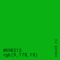 Цвет #09B212 в цветовой модели RGB обозначается тремя октетами (9, 178, 18) в десятичном формате и #09B212 в шестнадцатиричном (hex) формате, которые являются интенсивностью красного 9 (hex 09), интенсивность зелёного 178 (hex B2) и интенсивность синего 18 (hex 12).