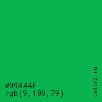 Цвет #09B44F в цветовой модели RGB обозначается тремя октетами (9, 180, 79) в десятичном формате и #09B44F в шестнадцатиричном (hex) формате, которые являются интенсивностью красного 9 (hex 09), интенсивность зелёного 180 (hex B4) и интенсивность синего 79 (hex 4F).