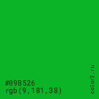 Цвет #09B526 в цветовой модели RGB обозначается тремя октетами (9, 181, 38) в десятичном формате и #09B526 в шестнадцатиричном (hex) формате, которые являются интенсивностью красного 9 (hex 09), интенсивность зелёного 181 (hex B5) и интенсивность синего 38 (hex 26).