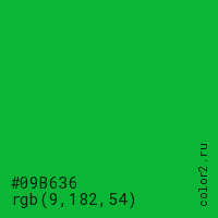 Цвет #09B636 в цветовой модели RGB обозначается тремя октетами (9, 182, 54) в десятичном формате и #09B636 в шестнадцатиричном (hex) формате, которые являются интенсивностью красного 9 (hex 09), интенсивность зелёного 182 (hex B6) и интенсивность синего 54 (hex 36).