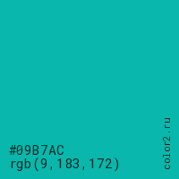 Цвет #09B7AC в цветовой модели RGB обозначается тремя октетами (9, 183, 172) в десятичном формате и #09B7AC в шестнадцатиричном (hex) формате, которые являются интенсивностью красного 9 (hex 09), интенсивность зелёного 183 (hex B7) и интенсивность синего 172 (hex AC).
