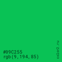Цвет #09C255 в цветовой модели RGB обозначается тремя октетами (9, 194, 85) в десятичном формате и #09C255 в шестнадцатиричном (hex) формате, которые являются интенсивностью красного 9 (hex 09), интенсивность зелёного 194 (hex C2) и интенсивность синего 85 (hex 55).