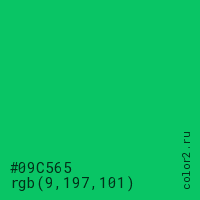 Цвет #09C565 в цветовой модели RGB обозначается тремя октетами (9, 197, 101) в десятичном формате и #09C565 в шестнадцатиричном (hex) формате, которые являются интенсивностью красного 9 (hex 09), интенсивность зелёного 197 (hex C5) и интенсивность синего 101 (hex 65).