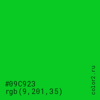 Цвет #09C923 в цветовой модели RGB обозначается тремя октетами (9, 201, 35) в десятичном формате и #09C923 в шестнадцатиричном (hex) формате, которые являются интенсивностью красного 9 (hex 09), интенсивность зелёного 201 (hex C9) и интенсивность синего 35 (hex 23).