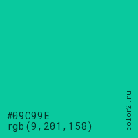 Цвет #09C99E в цветовой модели RGB обозначается тремя октетами (9, 201, 158) в десятичном формате и #09C99E в шестнадцатиричном (hex) формате, которые являются интенсивностью красного 9 (hex 09), интенсивность зелёного 201 (hex C9) и интенсивность синего 158 (hex 9E).