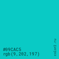 Цвет #09CAC5 в цветовой модели RGB обозначается тремя октетами (9, 202, 197) в десятичном формате и #09CAC5 в шестнадцатиричном (hex) формате, которые являются интенсивностью красного 9 (hex 09), интенсивность зелёного 202 (hex CA) и интенсивность синего 197 (hex C5).