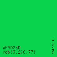 Цвет #09D24D в цветовой модели RGB обозначается тремя октетами (9, 210, 77) в десятичном формате и #09D24D в шестнадцатиричном (hex) формате, которые являются интенсивностью красного 9 (hex 09), интенсивность зелёного 210 (hex D2) и интенсивность синего 77 (hex 4D).