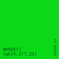 Цвет #09D917 в цветовой модели RGB обозначается тремя октетами (9, 217, 23) в десятичном формате и #09D917 в шестнадцатиричном (hex) формате, которые являются интенсивностью красного 9 (hex 09), интенсивность зелёного 217 (hex D9) и интенсивность синего 23 (hex 17).