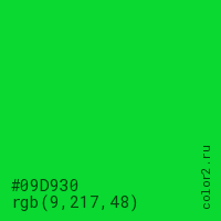 Цвет #09D930 в цветовой модели RGB обозначается тремя октетами (9, 217, 48) в десятичном формате и #09D930 в шестнадцатиричном (hex) формате, которые являются интенсивностью красного 9 (hex 09), интенсивность зелёного 217 (hex D9) и интенсивность синего 48 (hex 30).