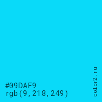 Цвет #09DAF9 в цветовой модели RGB обозначается тремя октетами (9, 218, 249) в десятичном формате и #09DAF9 в шестнадцатиричном (hex) формате, которые являются интенсивностью красного 9 (hex 09), интенсивность зелёного 218 (hex DA) и интенсивность синего 249 (hex F9).