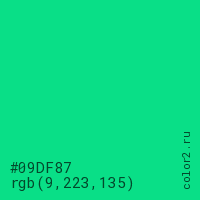 Цвет #09DF87 в цветовой модели RGB обозначается тремя октетами (9, 223, 135) в десятичном формате и #09DF87 в шестнадцатиричном (hex) формате, которые являются интенсивностью красного 9 (hex 09), интенсивность зелёного 223 (hex DF) и интенсивность синего 135 (hex 87).