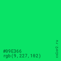 Цвет #09E366 в цветовой модели RGB обозначается тремя октетами (9, 227, 102) в десятичном формате и #09E366 в шестнадцатиричном (hex) формате, которые являются интенсивностью красного 9 (hex 09), интенсивность зелёного 227 (hex E3) и интенсивность синего 102 (hex 66).