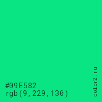 Цвет #09E582 в цветовой модели RGB обозначается тремя октетами (9, 229, 130) в десятичном формате и #09E582 в шестнадцатиричном (hex) формате, которые являются интенсивностью красного 9 (hex 09), интенсивность зелёного 229 (hex E5) и интенсивность синего 130 (hex 82).