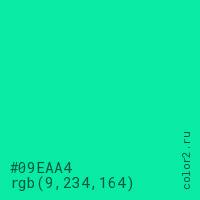 Цвет #09EAA4 в цветовой модели RGB обозначается тремя октетами (9, 234, 164) в десятичном формате и #09EAA4 в шестнадцатиричном (hex) формате, которые являются интенсивностью красного 9 (hex 09), интенсивность зелёного 234 (hex EA) и интенсивность синего 164 (hex A4).
