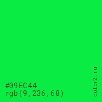 Цвет #09EC44 в цветовой модели RGB обозначается тремя октетами (9, 236, 68) в десятичном формате и #09EC44 в шестнадцатиричном (hex) формате, которые являются интенсивностью красного 9 (hex 09), интенсивность зелёного 236 (hex EC) и интенсивность синего 68 (hex 44).